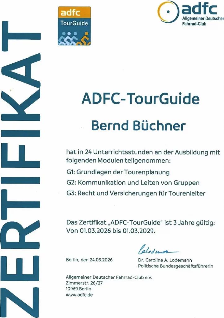 Als durch den Allgemeinen Deutscher Fahrrad-Club (ADFC) zertifizierter Anbieter steht mein Angebot für geprüfte Qualität im Fahrradtourismus. Der ADFC ist die größte Interessenvertretung für Radfahrende in Deutschland und entwickelt seit vielen Jahren verbindliche Qualitätsstandards für Radreisen und Tourismusangebote